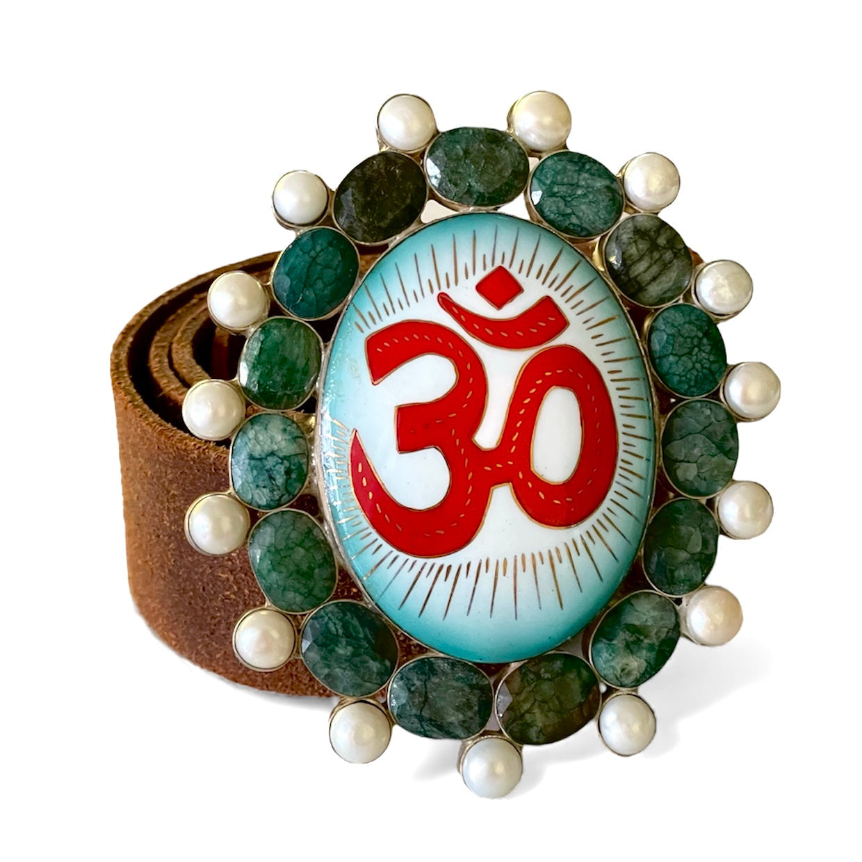 Handmade with intention, this gemstone belt buckle centers around a hand-painted enamel OM symbol detailed in gold — a sacred sound and spiritual icon representing universal connection, peace, and creation.